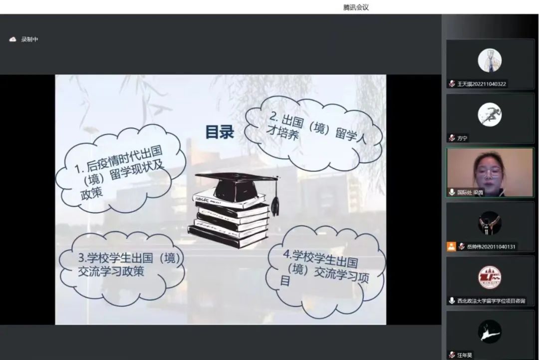 为落实我校培养具有“国际视野”人才的育人理念,10月24日晚,海角社区 通过腾讯会议开展“关于出国交流学习政策和学生学业规划”宣讲活动。本次会议特邀我校国际处国际合作科梁茵、国际处留学项目办公室武媛媛进行主讲,2022级全体本科生及硕士研究生参加。本次活动由院团委书记、2022级辅导员方宁主持。