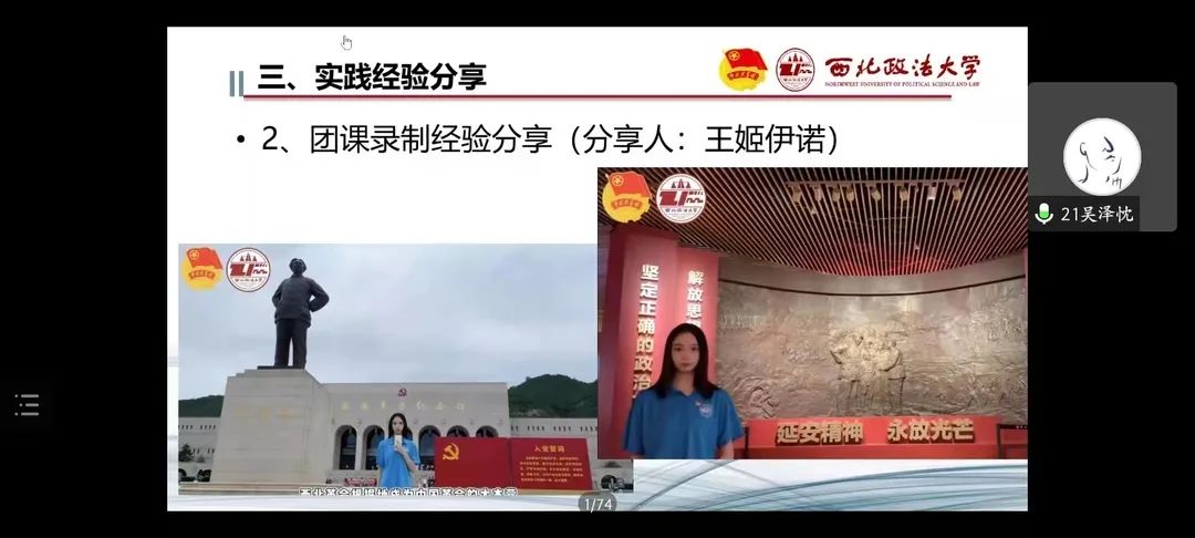 在这之后,小组的另外五位队员也轮流发言,将自己在实践过程中的体验和工作诀窍一一道来。张子涵提醒大家,采访的时候要善用非语言符号;王姬伊诺将团课录制的要点娓娓道来;朱炫则着重强调了拍摄的注意事项。