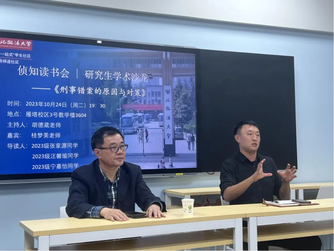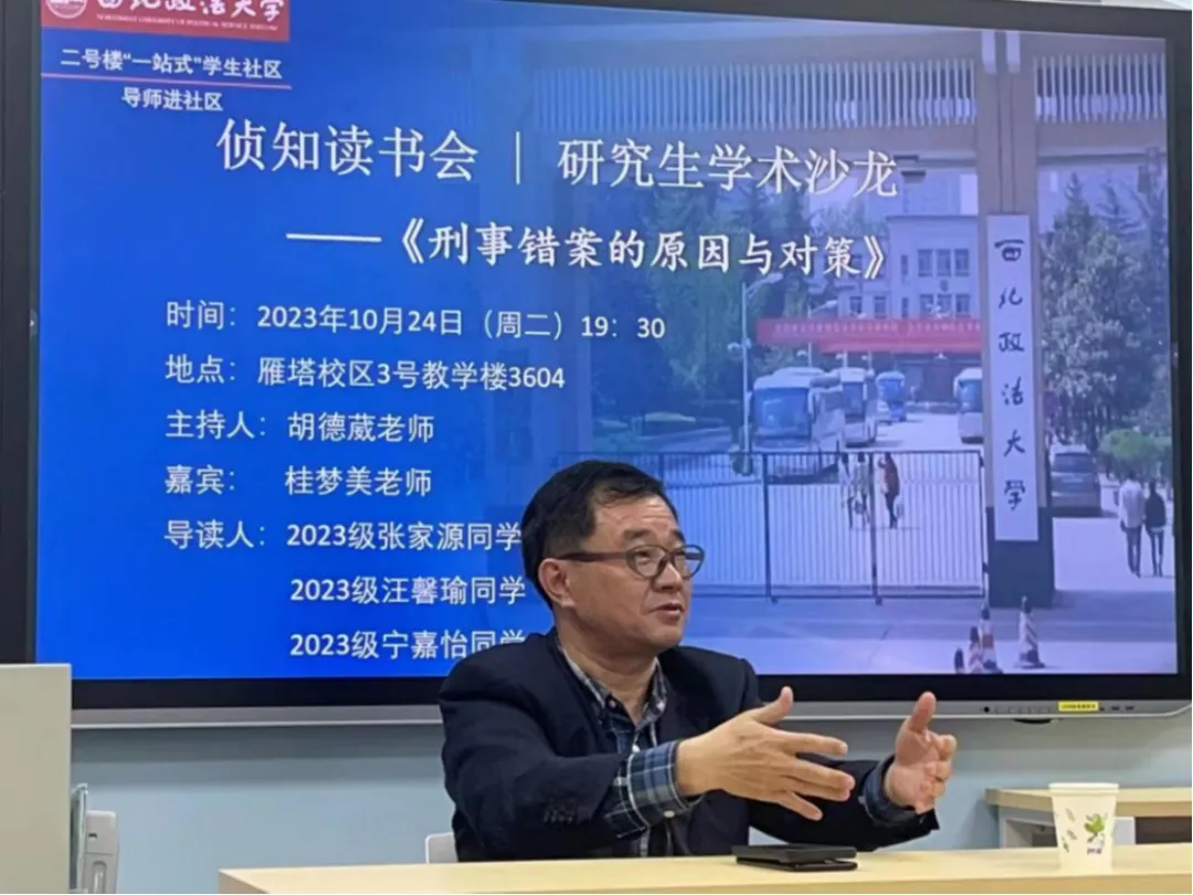 为推动“一站式”学生社区建设,落实导师进社区制度,加强同研究生的交流,营造活跃的学术研究氛围,10月24日晚,海角社区 (公共安全法海角社区 )于雁塔校区3号楼604教室举行研究生学术沙龙——《刑事错案的原因与对策》。海角社区 副院长、副教授、法学博士、硕士生导师桂梦美担任分享嘉宾。本次读书会由侦查学教研室主任胡德葳主持,2023级张家源、汪馨瑜、宁嘉怡同学进行导读分享。