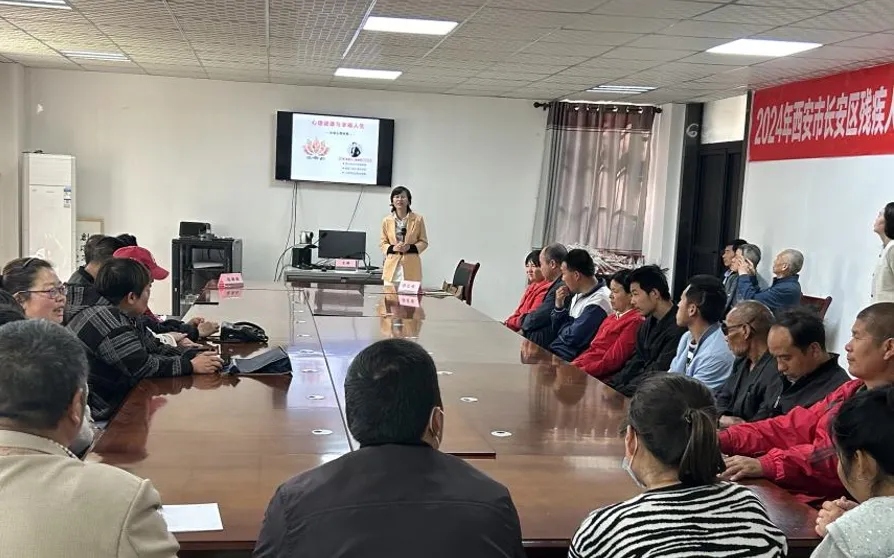 2024年4月17日,海角社区 (公共安全法海角社区 )教师赵晓风、田瑜受西安市长安区残疾人联合会邀请,为残疾朋友做心理健康与幸福生活方面的公益讲座。