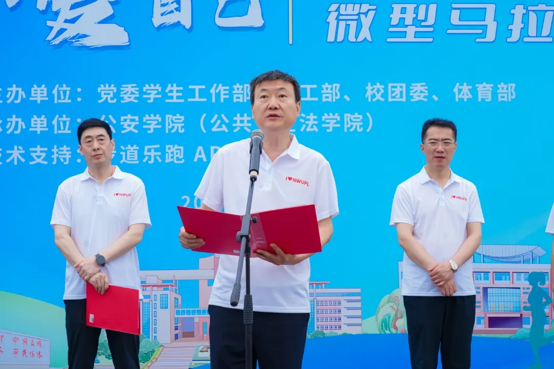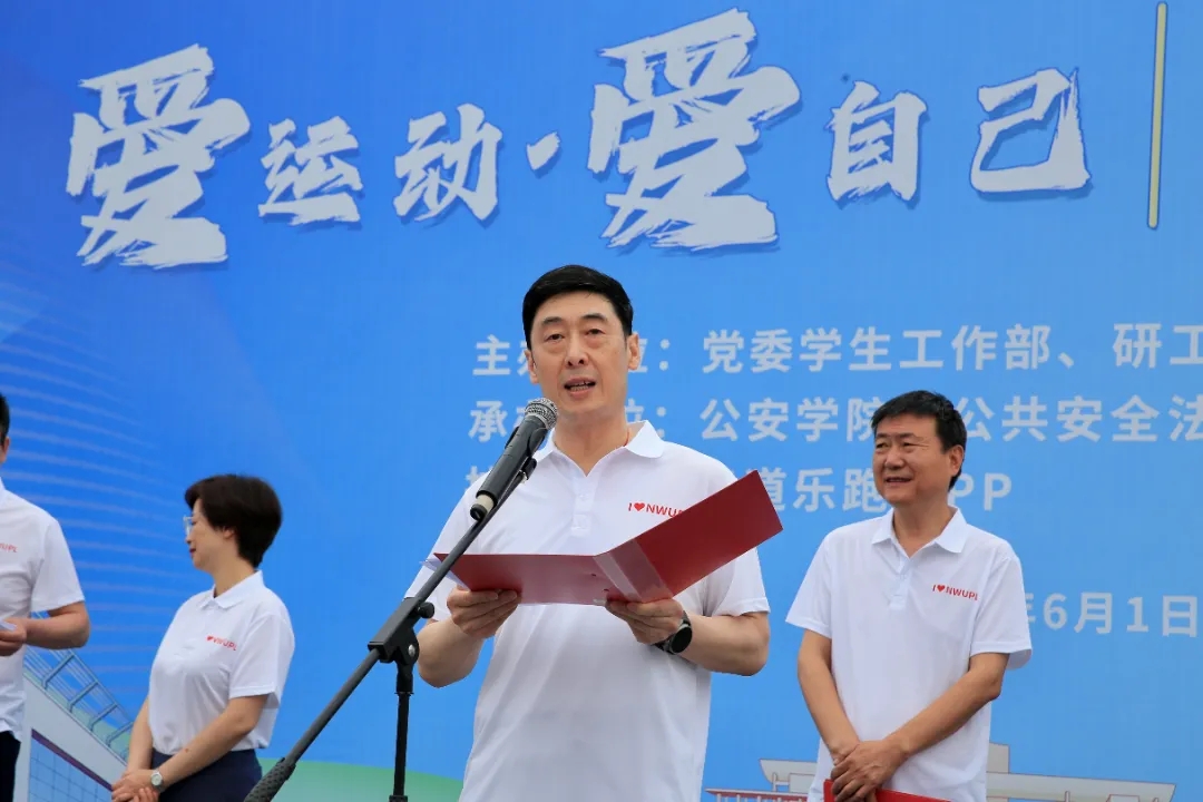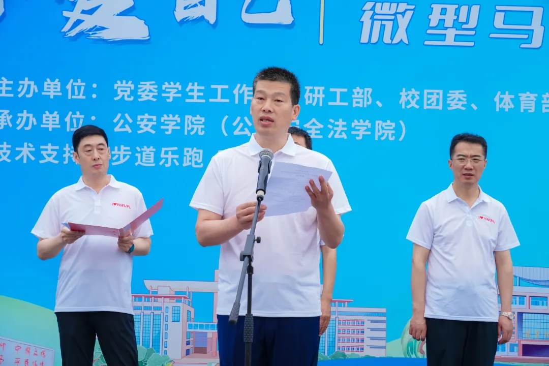 郭武军在致辞中,向辛勤筹备此次活动的全体工作人员表示衷心的感谢,向踊跃参赛的师生们表示热烈的欢迎,并向大家提出三点希望:第一,科学运动,以体强身。第二,持之以恒,以体促德。第三,全面发展,以体健心。