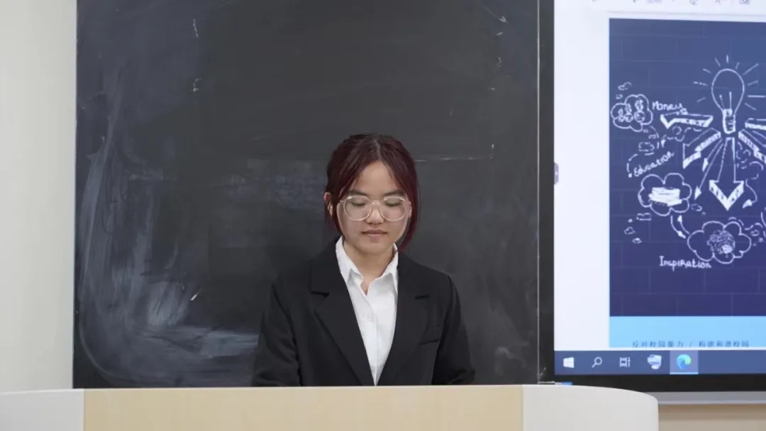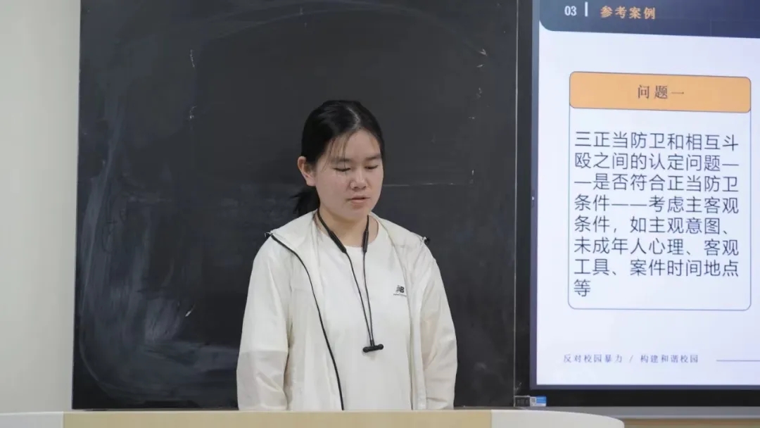 23级李楠同学着重向大家介绍了当今反霸凌机制以及是否应当单独立法的社会争议点。李同学结合当下反霸凌机制的一些问题与困境,联系相关类似的案件与最新出台的相关法规与条例,聚焦校园霸凌单独立法的好处以及面临的风险与挑战这一争议问题进行分析,并就如何构建多方协同发力的反霸凌机制来应对校园霸凌提出了自己的建议。
