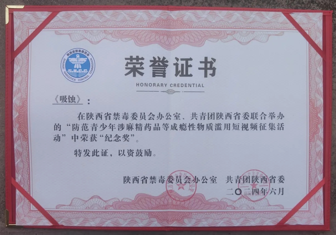 为深入学习贯彻习近平总书记关于禁毒工作重要指示精神,进一步巩固学校毒品预防教育成果,切实增强学生识毒防毒拒毒意识和能力,近日,陕西省禁毒委员会办公室、共青团陕西省委联合举办“防范青少年涉麻精药品等成瘾性物质滥用短视频征集活动”,海角社区作品《吸蚀》荣获纪念奖。
