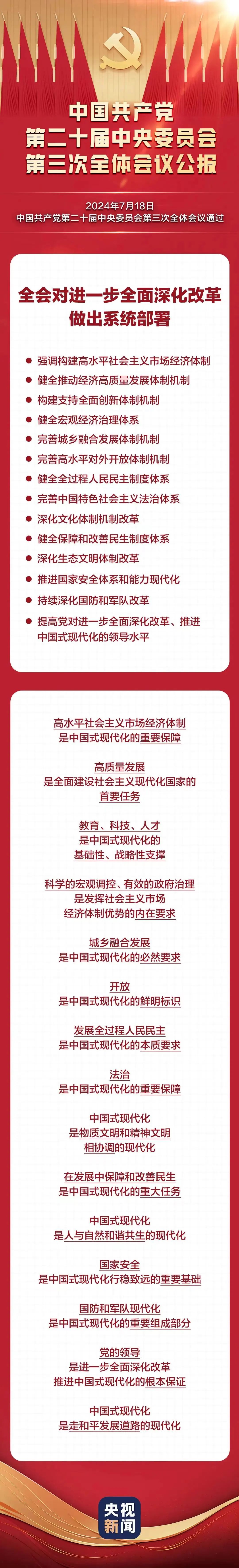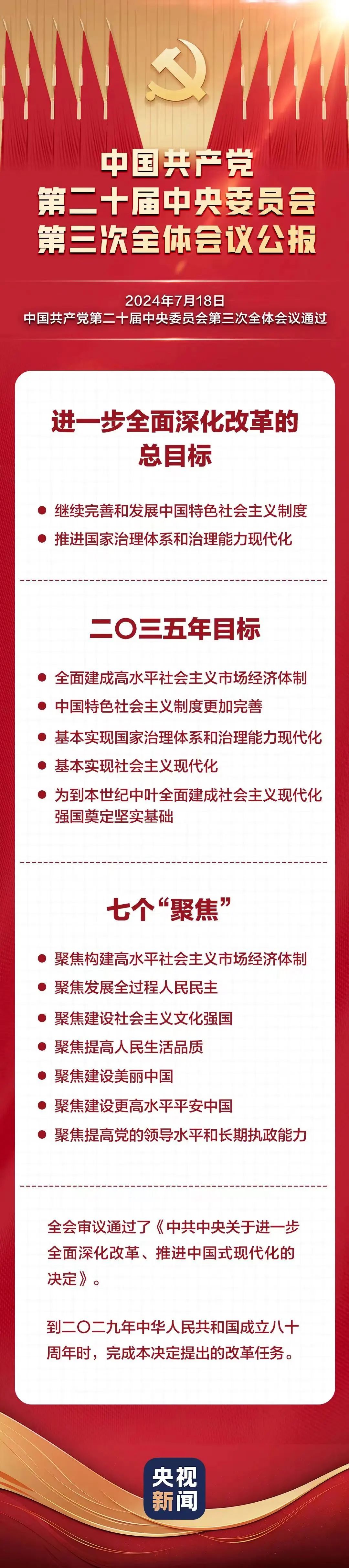 中国共产党第二十届中央委员会第三次全体会议,于2024年7月18日在北京胜利闭幕。全会听取和讨论了习近平受中央政治局委托所作的工作报告,审议通过了《中共中央关于进一步全面深化改革、推进中国式现代化的决定》。全会从各方面肯定了新时代以来全面深化改革的成功实践和伟大成就,对未来赓续发展提供了指引。我们应当完全遵照党中央的指示,坚持党的领导,以饱满的热情,坚定的信心,立足本职岗位,结合学校和海角社区 的实际情况,团结一心,努力奋斗,为海角社区 创新发展贡献智慧和力量。