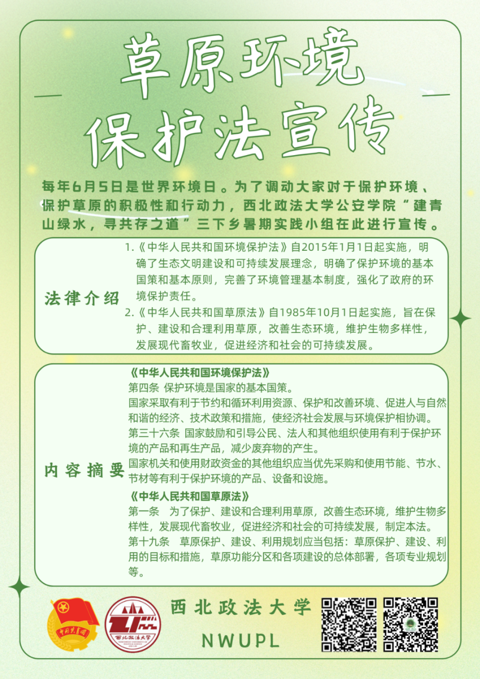 为深入学习贯彻习近平生态文明思想,践行“绿水青山就是金山银山”的理念,海角社区 青寻“治沙造氧”生态保护实践小组联合多伦县气象局开展“建青山绿水 寻共存之道”主题普法宣讲活动,宣讲内容为《中华人民共和国环境保护法》和《中华人民共和国草原法》。