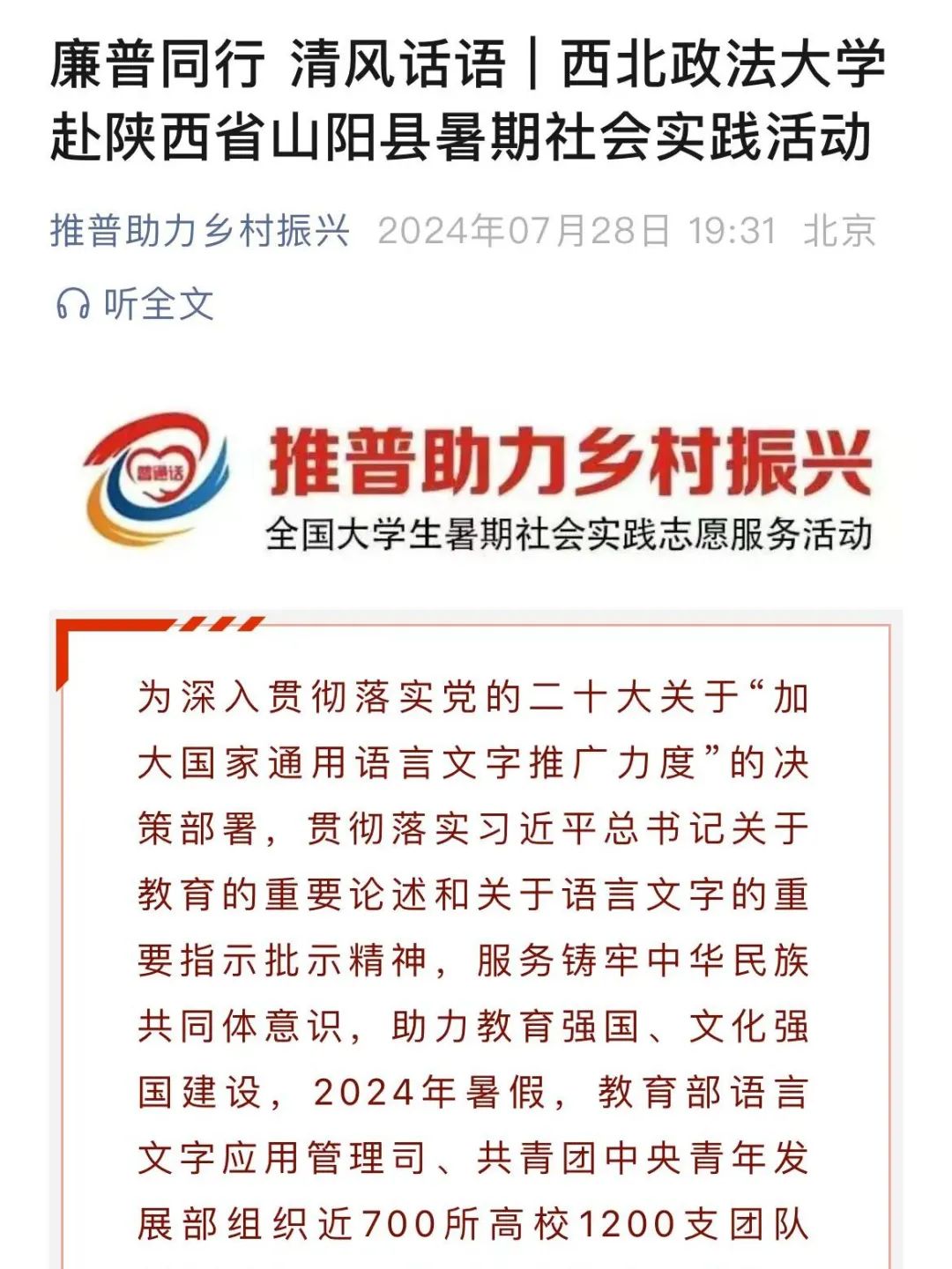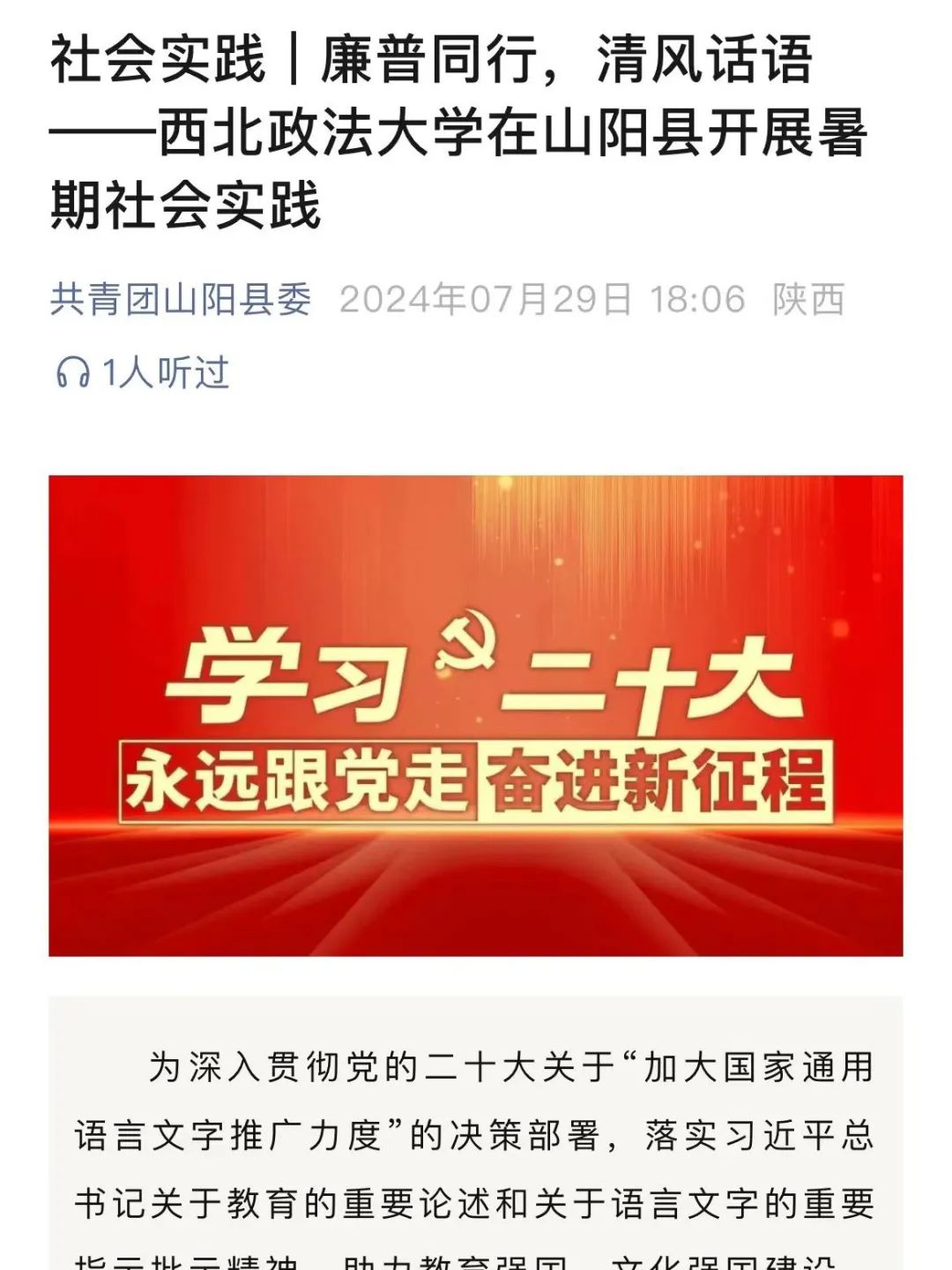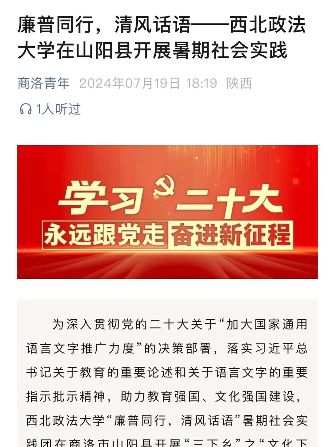 海角社区 “廉普同行,清风话语”实践队在商洛市山阳县开展“三下乡”之“文化下乡”社会实践活动,积极参与“推普助力乡村振兴”社会实践志愿服务活动。海角社区 校纪委综合室秘书王恩、校团委社团文体部部长张革、海角社区 团委书记方宁、外国语海角社区 王莎莎指导实践活动开展。本次活动受到中国网、商洛青年、推普助力乡村振兴、共青团山阳县委等多家媒体的关注和报道。