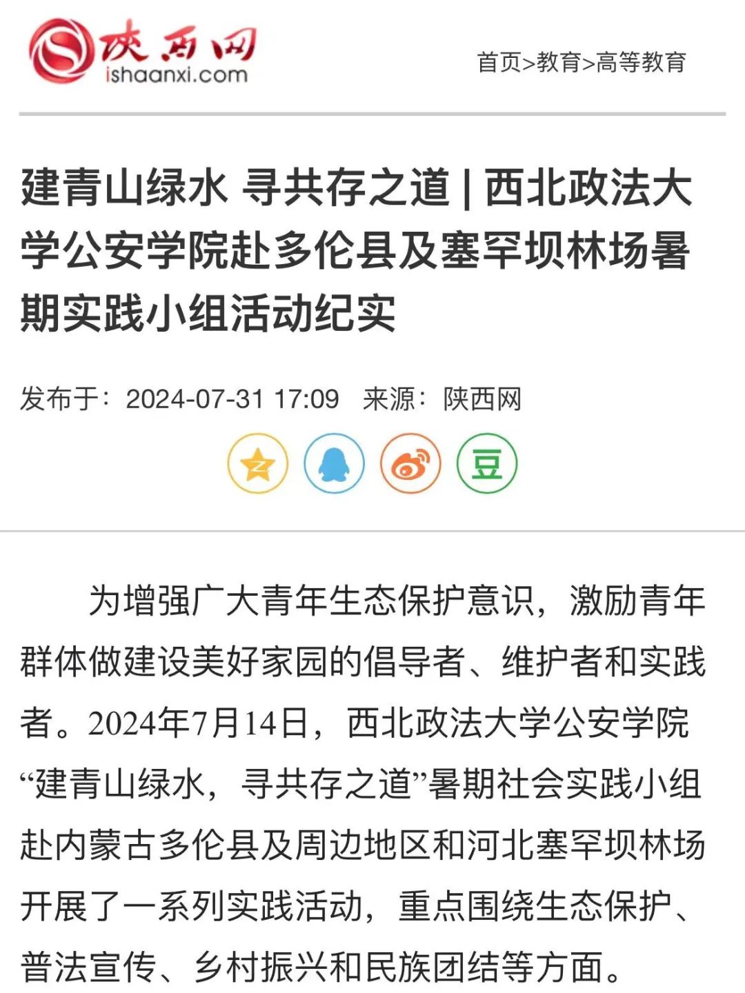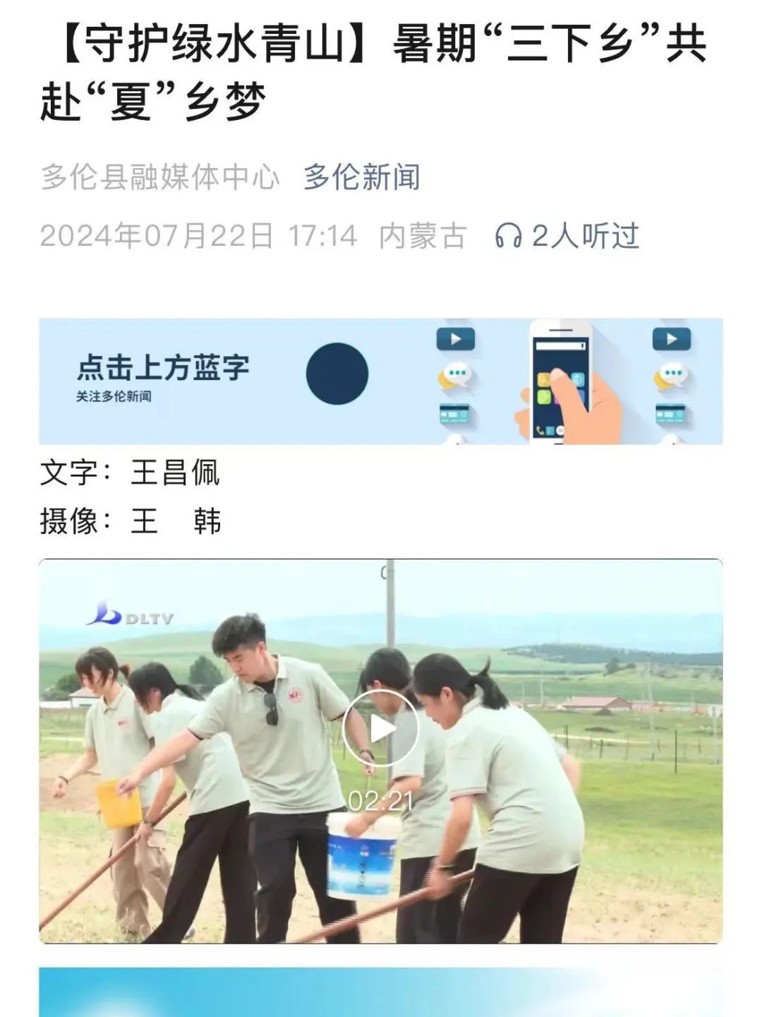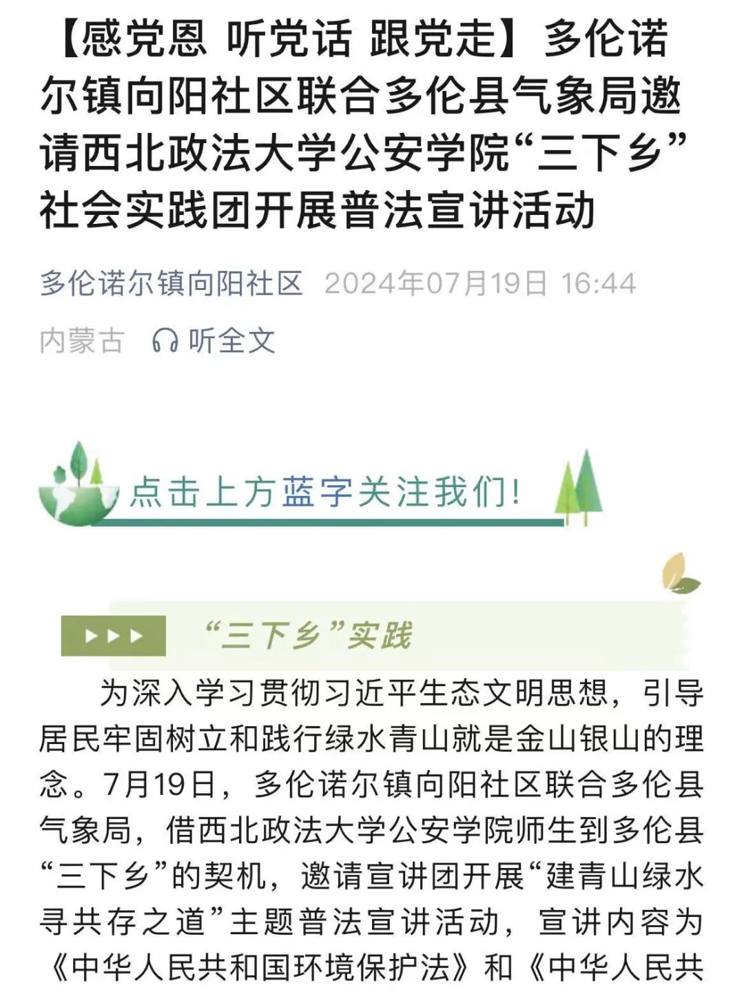 海角社区 “建青山绿水,寻共存之道”暑期社会实践队与海角社区 辅导员及实践队指导老师李沛君赴内蒙古多伦县及河北塞罕坝地区,开展以生态保护、普法宣传、乡村振兴和民族团结为主题的暑期三下乡实践活动。实践队聚焦基层及生态文明保护,被中国网、中华网、央视频、陕西网、内蒙古热线等数十家媒体报道。