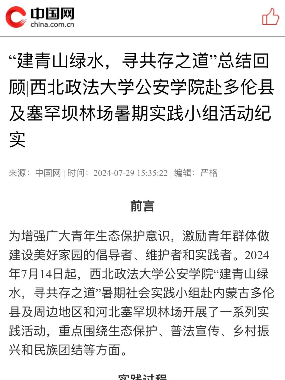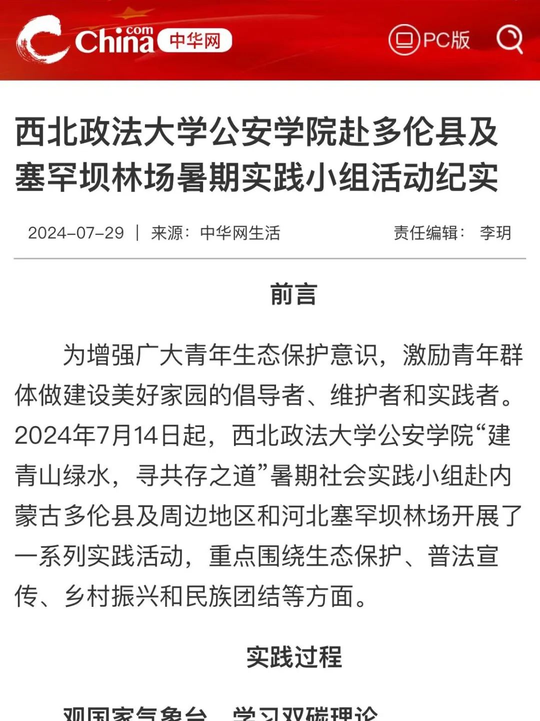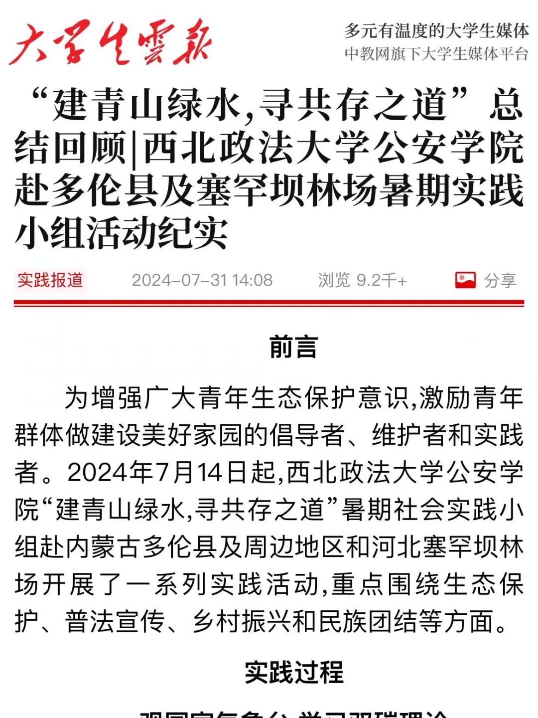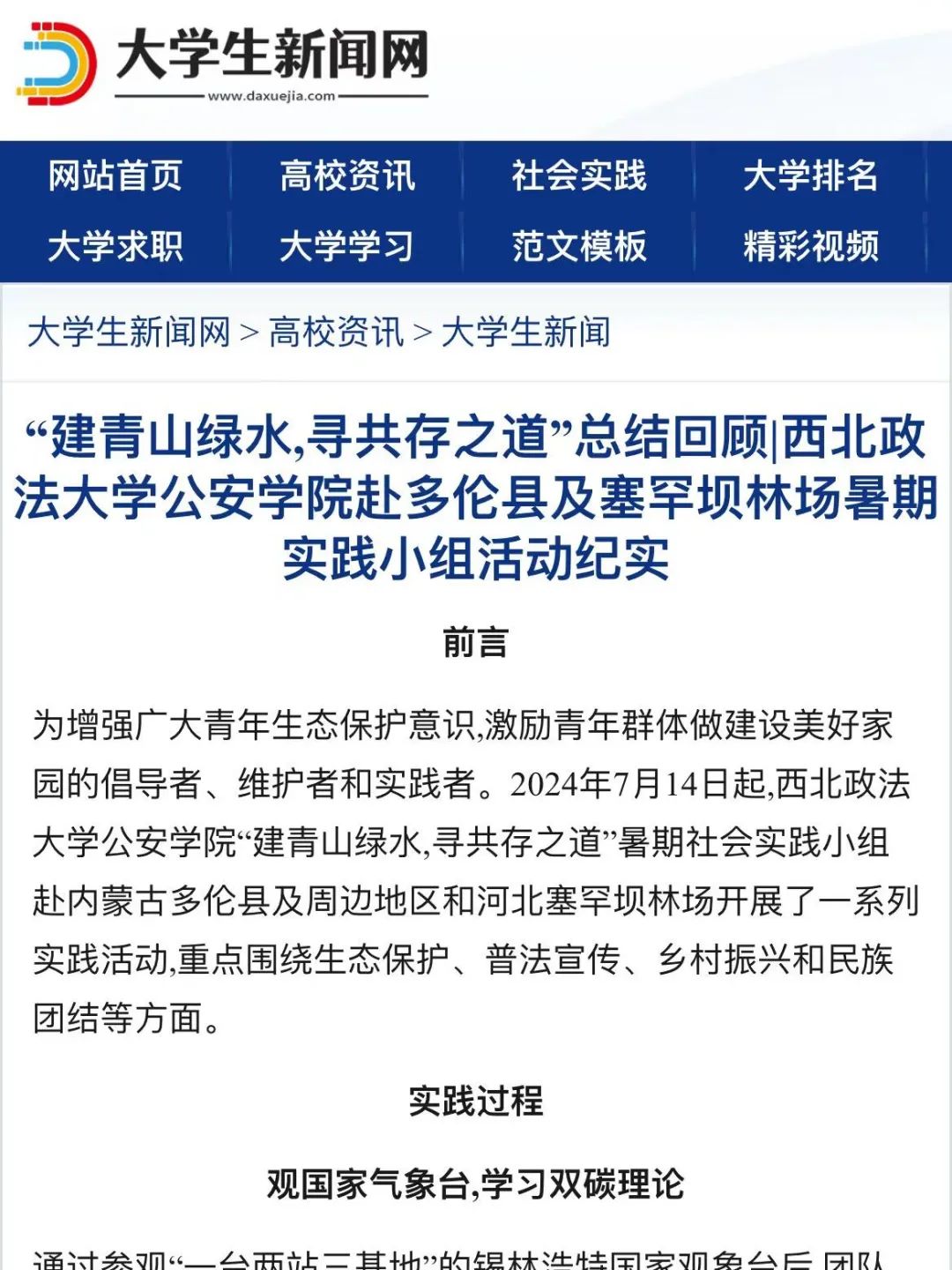 海角社区 “建青山绿水,寻共存之道”暑期社会实践队与海角社区 辅导员及实践队指导老师李沛君赴内蒙古多伦县及河北塞罕坝地区,开展以生态保护、普法宣传、乡村振兴和民族团结为主题的暑期三下乡实践活动。实践队聚焦基层及生态文明保护,被中国网、中华网、央视频、陕西网、内蒙古热线等数十家媒体报道。