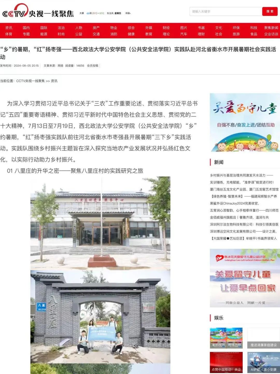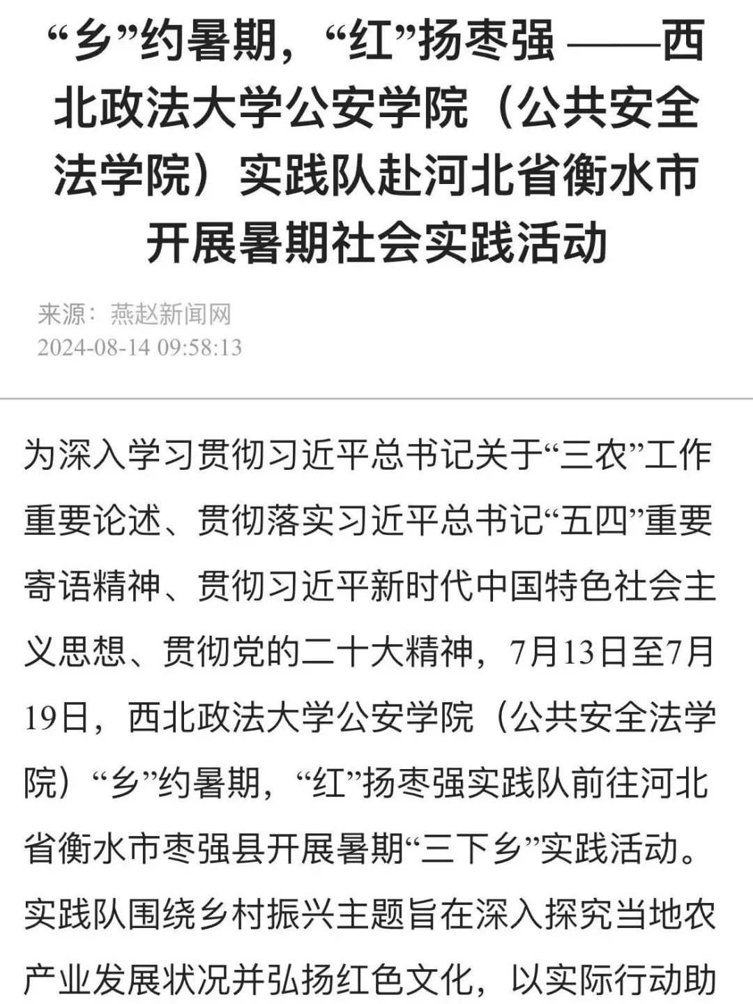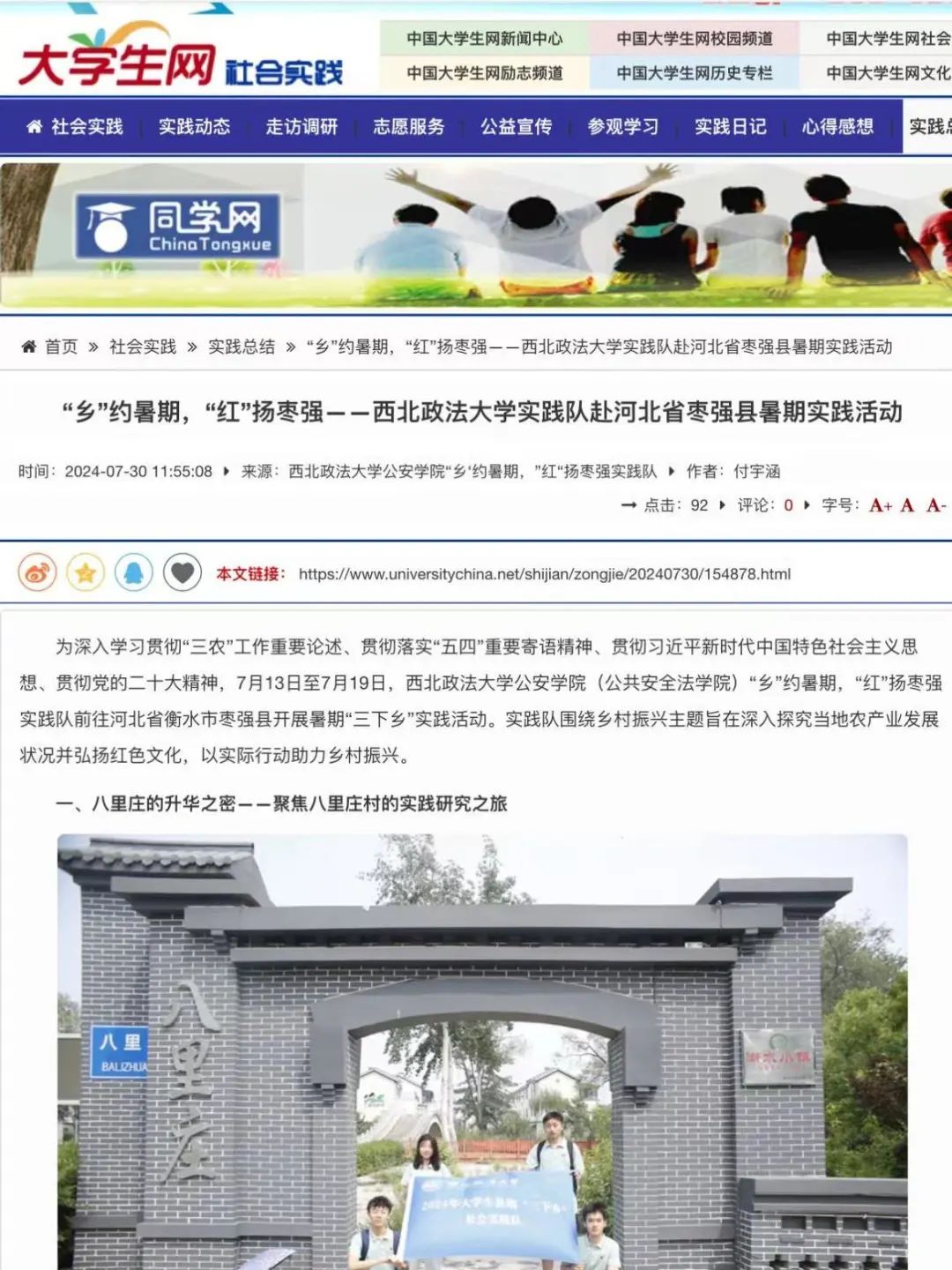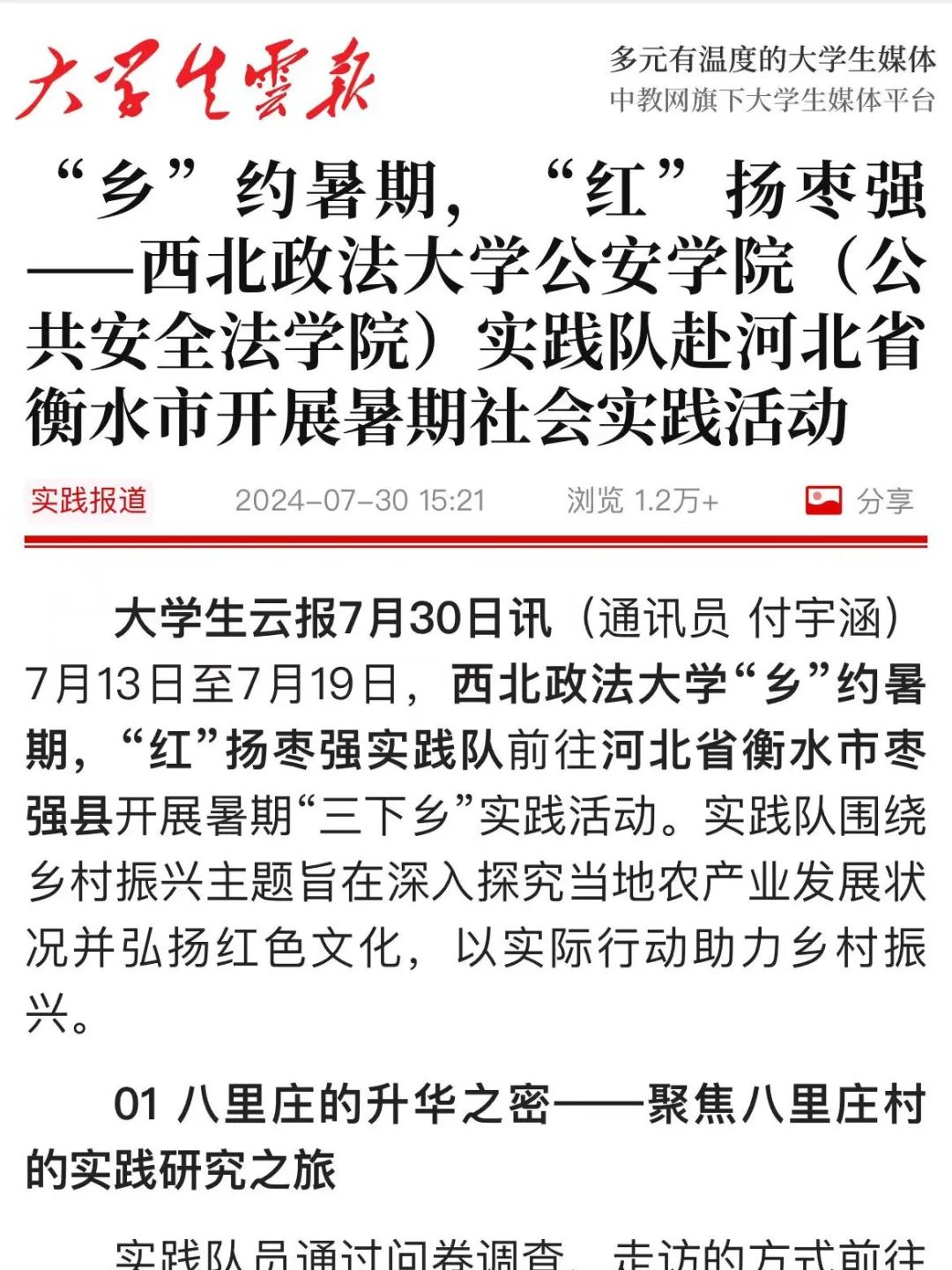 海角社区 “乡”约暑期,“红”扬枣强实践队前往河北省衡水市枣强县开展暑期“三下乡”实践活动。实践队围绕乡村振兴主题旨在深入探究当地农产业发展状况并弘扬红色文化,以实际行动助力乡村振兴。团队取得丰富的实践成果并被中国网、大学生云报、CCTV聚焦等多家媒体报道。团队成员在本次社会实践中充分发实事求是、吃苦耐劳的品质,展现出西法大学生优秀的青年风貌,得到社会多方面认可,为学校、海角社区 赢得良好口碑和关注。