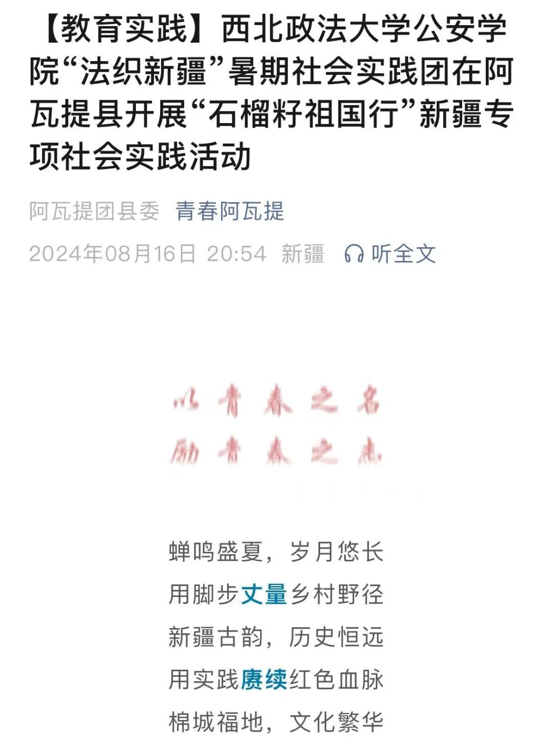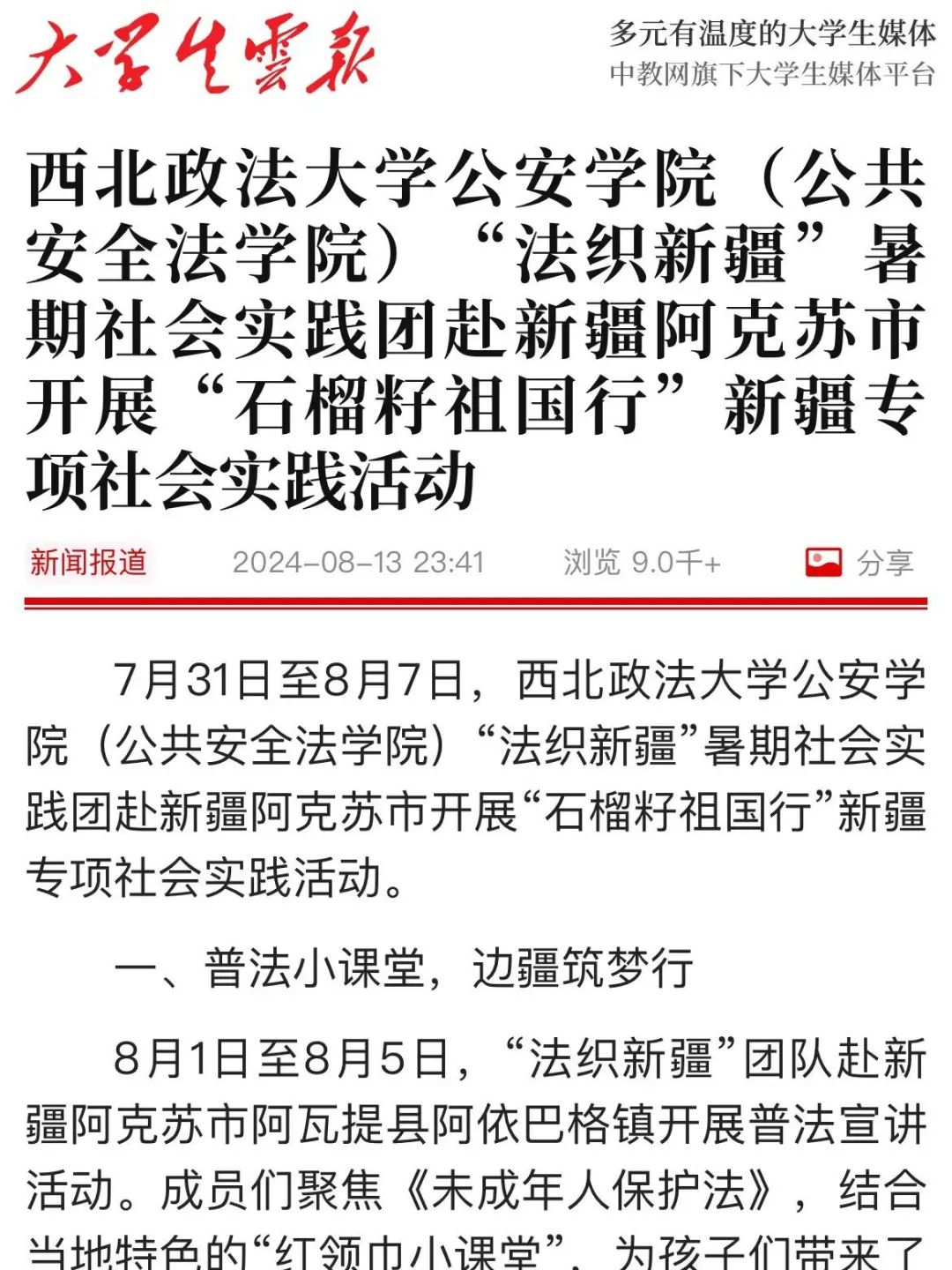 海角社区 “法织新疆”暑期社会实践团赴新疆阿克苏市开展“石榴籽祖国行”新疆专项社会实践活动。本次实践活动的显著成效赢得了当地政府和居民的普遍赞誉和高度评价,其实践成果被大学生云报、青春阿瓦提、阿瓦提县融.阿依巴格镇站等多家媒体报道,展现了西法大青年良好的精神风貌,为学校、海角社区 赢得口碑和关注。