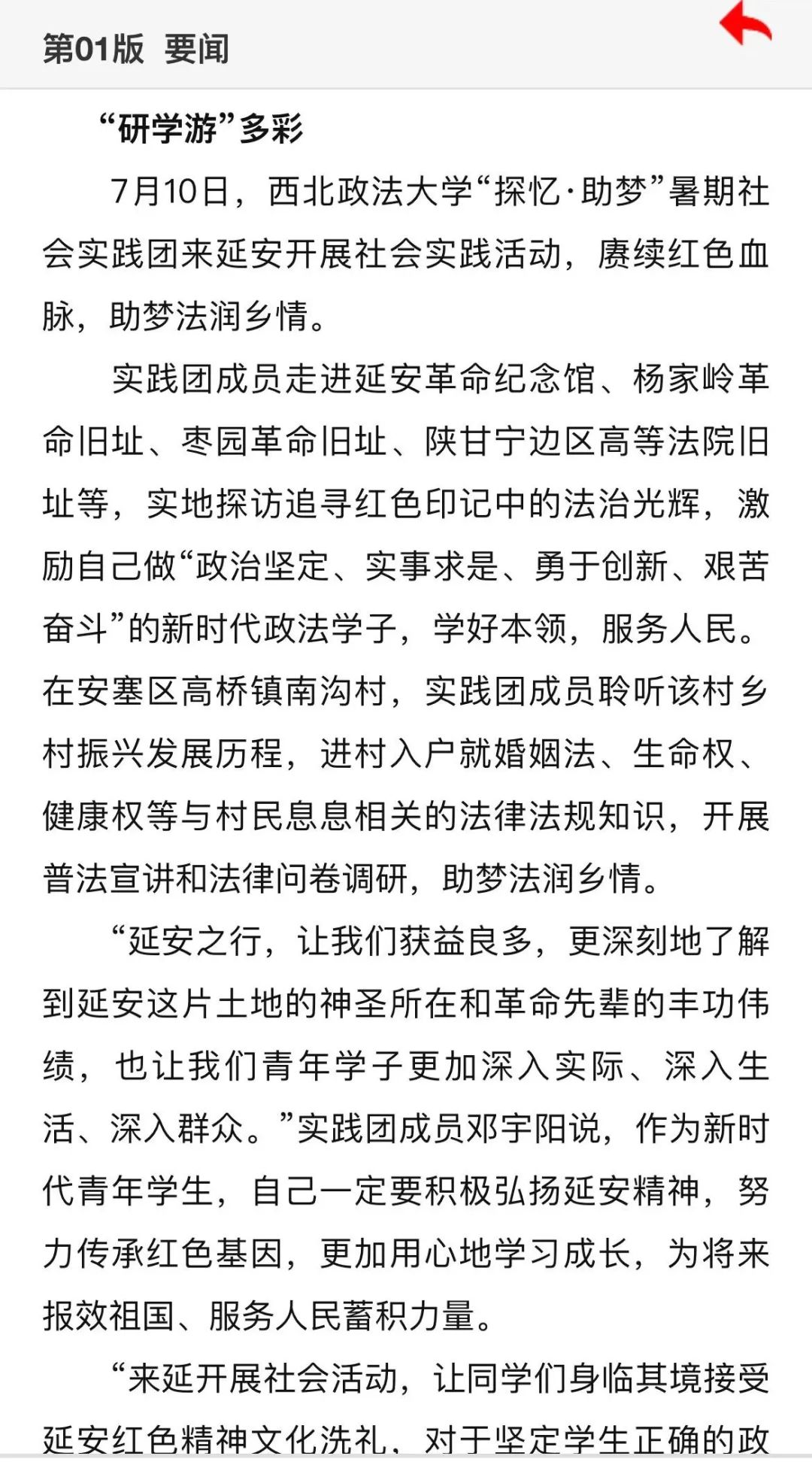 海角社区 “探忆·筑梦”实践队开展为期两周的三下乡活动,在海角社区 党委副书记李霞,团委书记方宁,辅导员李沛君、卫妍卓指导下为新时代法治建设贡献自己的力量。游览革命旧址,感悟延安精神。本次活动受到延安日报,大学生云报等多家媒体关注和报道,展现了西法大青年优良面貌,为学校海角社区 赢得口碑。