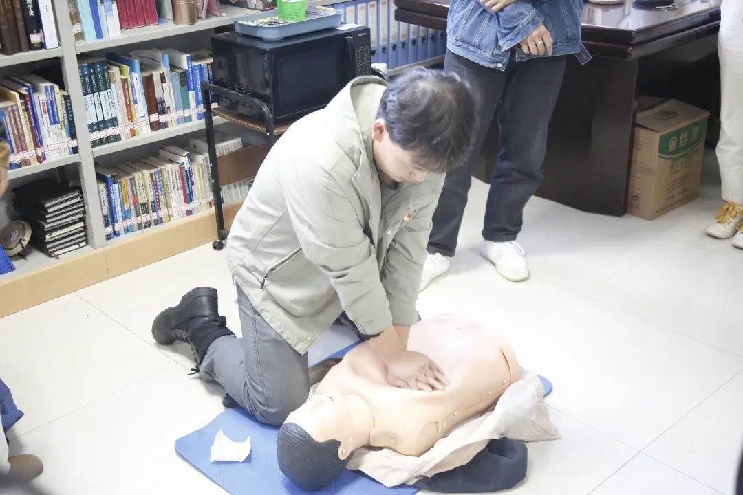 活动中,志愿者依托红十字会的学习平台,通过生动的案例讲解、科学的操作流程,系统地讲述了急救基础理论、常见急症识别及初步处理等知识,重点讲解了心肺复苏、人工呼吸等相关应急救护知识。支部成员全神贯注地聆听,积极参与互动。在志愿者的指导下,党支部成员轮流上阵,在模拟人身上进行实践操作,亲身体验了各式包扎方法以及复杂的骨折固定。支部成员纷纷表示,这些知识在关键时刻能成为挽救生命的“金钥匙”。