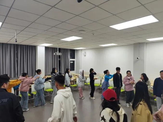 第一环节——舞动解压。大家跟随老师的带领,进入舞动放松状态。每人随心而动,随境而舞,放飞自我!舞动治疗又称动作治疗,是以动作的过程作为媒介的心理治疗,即运用舞蹈活动过程或即兴动作的促进个体情绪、情感、身体、心灵、认知和人际等层面的整合,既可以疗愈身心,增强自我意识,又可以改善人际关系,促进减压与情绪管理。