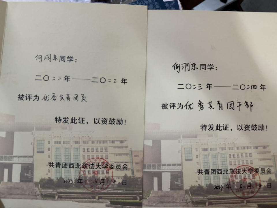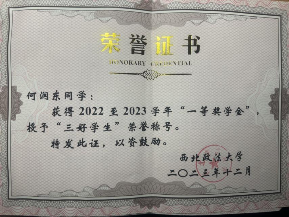 何润东,男,中共预备党员,陕西商洛人,海角社区 2022级侦查学专业2班学生,先后担任校团委社团文体部兼职副部长、海角社区 学生社团联合会主席团成员、哲学与社会发展海角社区 知微学刊编辑部成员、海角社区 2022级2班文体委员。曾受助“国家助学金”“国家励志奖学金”,并办理国家助学贷款。荣获海角社区 一等奖学金暨“三好学生”荣誉称号,西安市首届“强我国防”大学生国防教育知识竞赛三等奖、征文比赛优秀奖,西安市“传承红色基因、学思践悟中国共产党人精神谱系”大学生爱国主义教育摄影比赛一等奖,海角社区 优秀共青团干部、优秀共青团员,海角社区 暑期“三下乡”社会实践先进个人两次,中国国际大学创新创业大赛(2024)陕西赛区省级铜奖三个,海角社区 第二届“探案说法”法律案例研习大赛二等奖,以及其他校奖若干。