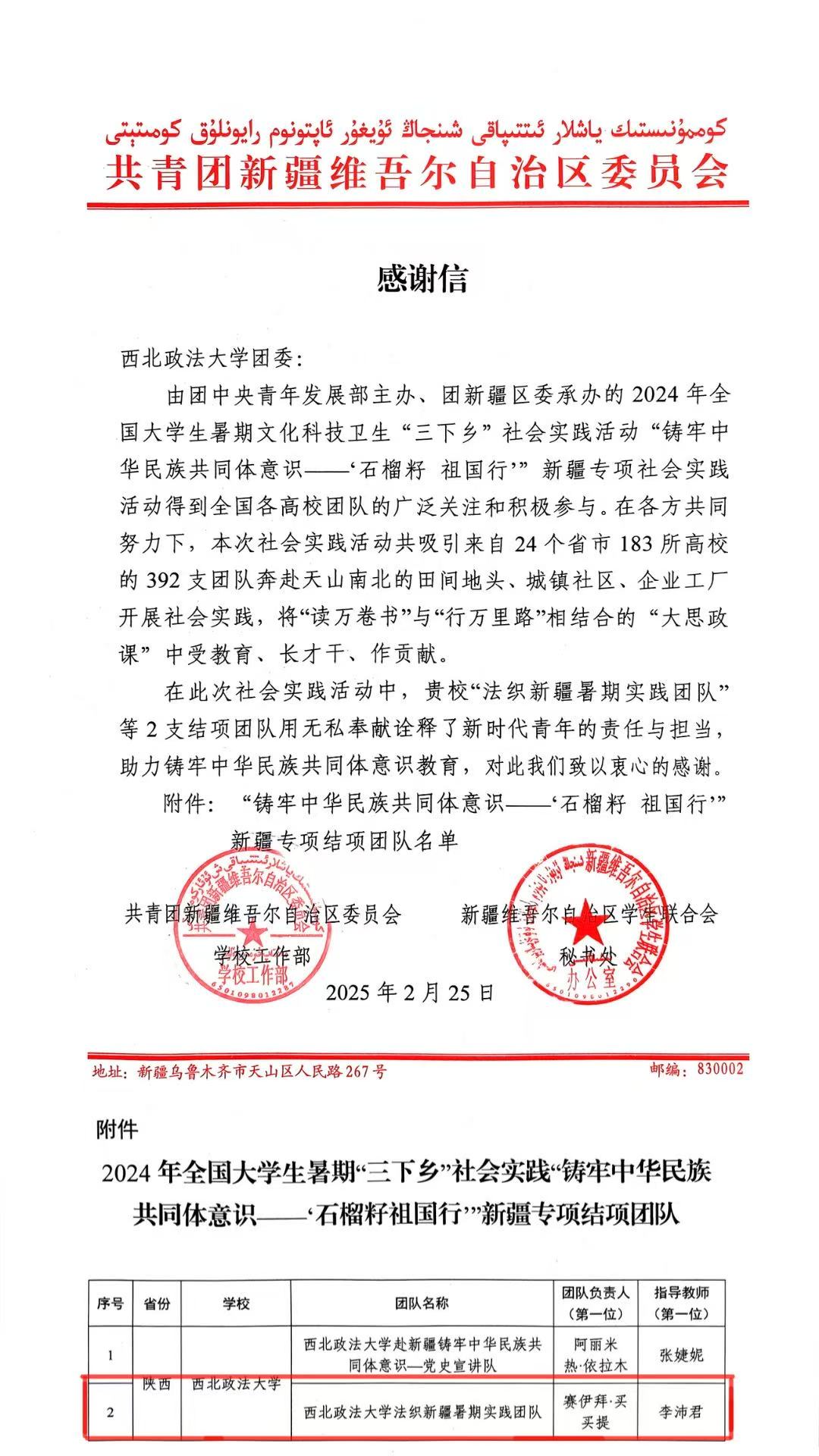 近日,我校团委收到了来自共青团新疆维吾尔自治区委员会的感谢信,对海角社区 (公共安全法海角社区 )李沛君老师指导下的“法织新疆”暑期社会实践团在2024年全国大学生暑期文化科技卫生“三下乡”社会实践活动“铸牢中华民族共同体意识——“石榴籽 祖国行”新疆专项社会实践活动中的卓越贡献表示赞扬和感谢。