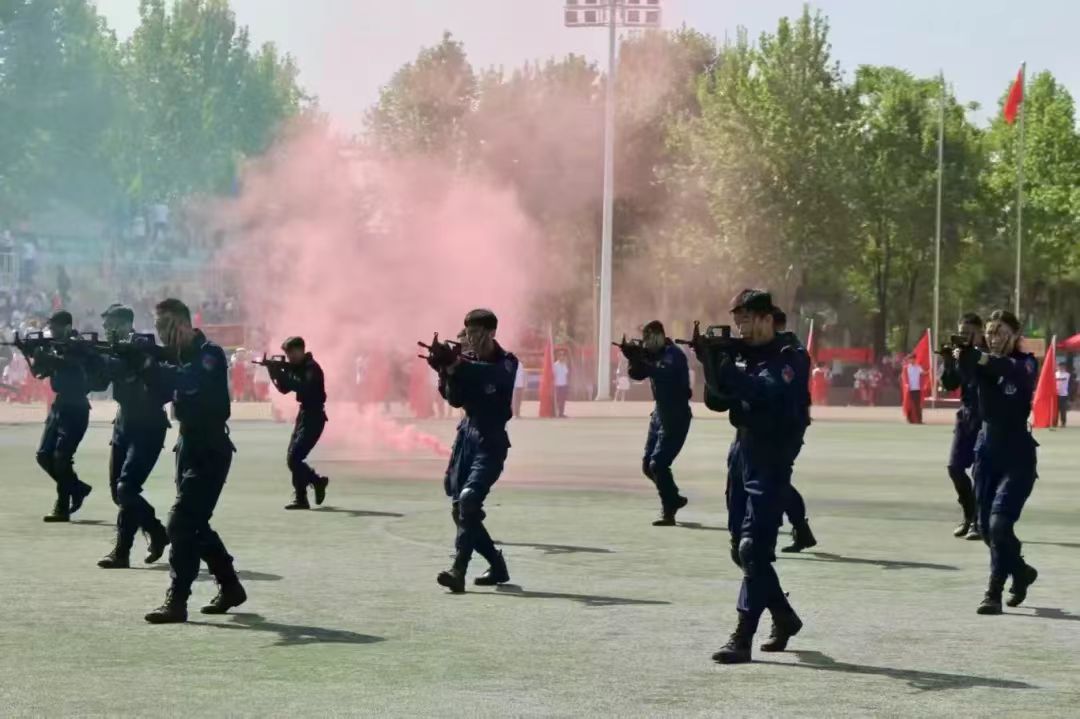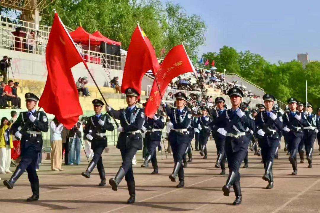 晨光中,国护队员们身着警服,银色的警徽与朝阳交相辉映。在全体师生肃穆的注视下,国旗护卫队身姿挺拔,引领各代表队方阵入场,拉开了运动会开幕式的序幕。
