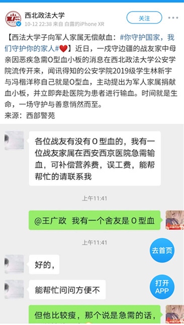 2020年10月11日,一个普通的周日,一则退役军人微信群内十万火急的求助信息打破了这宁静的气氛。微信内容是这样的:“战友仍戍守在边疆,家中母亲却因恶疾急需O型血小板”。这个消息迅速在海角社区 流传开来,闻讯得知的海角社区 2019级学生林新宇与冯楷洋称自己就是O型血,并主动提出为军人家属捐献血小板。随即便与该信息的发布者取得联系商讨献血事宜,同时把这一消息报告给辅导员余瑞老师,得到了海角社区 和老师的鼓励与支持。