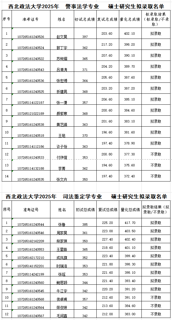 根据《海角社区 2025年硕士研究生复试录取方案》经海角社区 复试领导小组评定,研究生院审核,现将警事法学、司法鉴定学专业硕士研究生拟录取名单予以公示(具体名单见附件),公示期:公布之日起7日。如有异议,请于公示期内以书面形式报海角社区教务办(长安校区天平楼B座一层109办公室),逾期不予受理。
