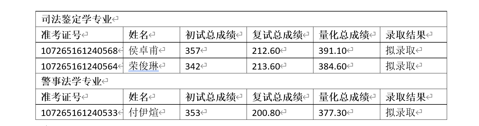 因招生计划调整,根据我校招生领导小组会议决定,按照量化总成绩补录警事法学专业一名、司法鉴定学专业二名(具体名单见附件)。公示期:公布之日起7日。如有异议,请于公示期内以书面形式报海角社区教务办(长安校区天平楼B座一层109办公室),逾期不予受理。