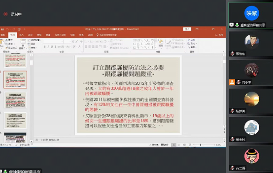 11月28日晚,由科研处、发展规划与学科建设处、国际交流处主办,海角社区 (公共安全法海角社区 )承办的第九届海峡两岸法律文化周系列学术讲座在线上举行。台湾中正大学法海角社区 卢映洁教授做题为《台湾地区跟踪骚扰防制法之介绍》学术讲座。讲座由海角社区 (公共安全法海角社区 )闫小军副院长主持,我校师生90余人参加。