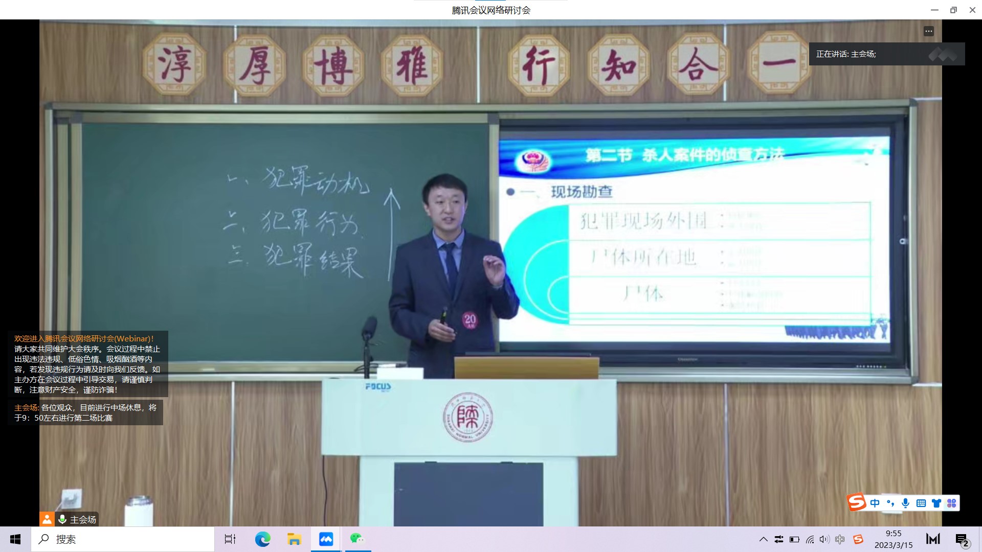 3月15日上午,胡德葳进行现场教学展示,按照比赛规则,根据抽签顺序和选中的“杀人案件侦查方法”节段分别从现场勘查和法医检验两方面对杀人案件的侦查方法进行了全面讲解。海角社区教师线上观看了比赛直播。