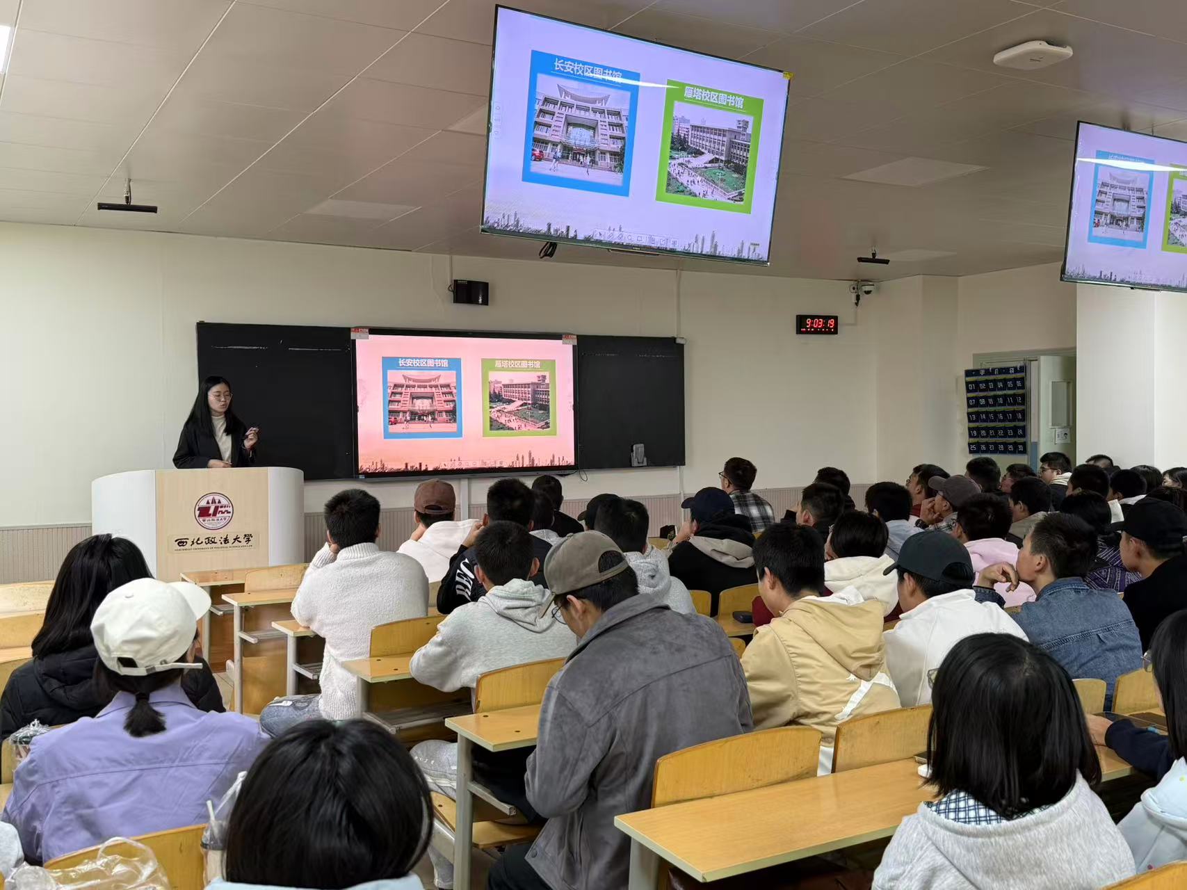 王亚茹从读者导航、纸质资源利用、数字资源利用、常见问题解决、图书馆服务等方面展开讲解,向新生介绍两个校区图书馆的馆藏分布情况以及纸质图书的查找、借阅与归还流程,演示了各类数字资源的使用方法。