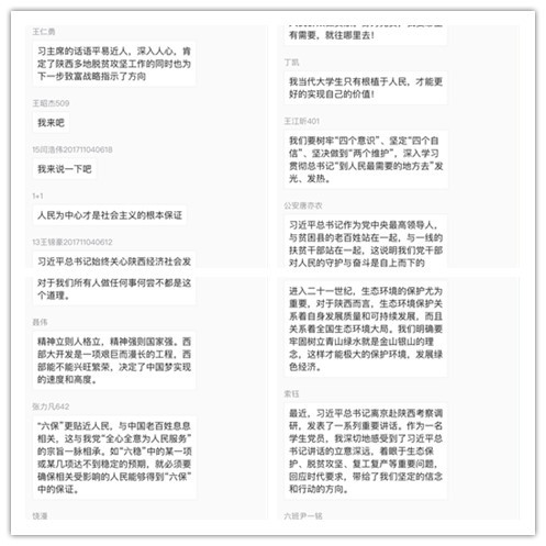 唐亦农同学看到总书记与一线扶贫干部站在一起,看到了我党对于人民群众的守护;王昭杰同学表示总书记一行给了我们战胜困难的决心;闫浩伟同学坚定自信,从自身做起,继承延安精神,无愧于历史选择;强磊同学认识到了历史和人民的重担,要创造出属于新时代青年人的功绩。在这几位同学发言期间,其他同学积极讨论,踊跃发言,发表自己的所感所想。