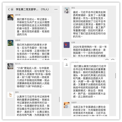 通过本次自主学习和网络学习,支部成员纷纷表示受益良多,习近平总书记在西安、商洛、安康等地深入考察,不仅关心复工复产,脱贫攻坚工作的开展,还了解了秦岭生态环境保护等情况。在社区,学校,企业,山区,自然保护区等地,总书记充分调研,并作出了一系列重要指示,在突如其来的新冠肺炎疫情考验下,要面对挑战,对内创新产业链推动经济高质量发展,对外构筑优良国际贸易通道,注重生态保护向自然修复休养生息转变,民生实事要做好,社会治理要加强。学习总书记的重要指示,让我们认识到了,作为大学生党员,要坚持不懈学习延安精神,淬炼党性,坚定信仰,争取早日为陕西新时代追赶超越新篇章,中华民族伟大复兴贡献更大的力量。