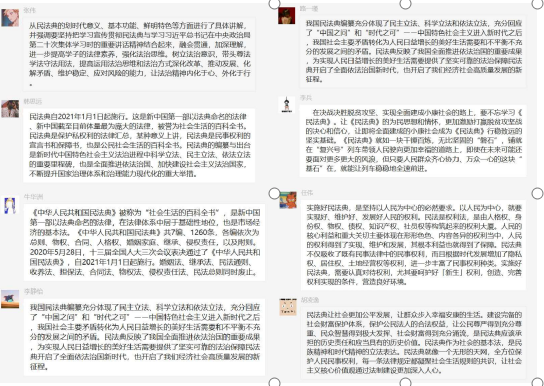 师生们一致表示,作为政法人,我们要充分发挥学科专业优势,认真学习研究《民法典》,深刻理解其鲜明特色和精神内涵,将《民法典》的运用贯彻到工作和学习的始终,在教学活动和科研创新中将《民法典》的研究推向深入。同时,要牢牢把握“人民至上”的价值取向,始终坚持人民主体地位,自觉通过各种形式宣传和维护《民法典》,使《民法典》真正走到群众身边,走进群众心里,为推进国家法治进程贡献自己的智慧和力量。