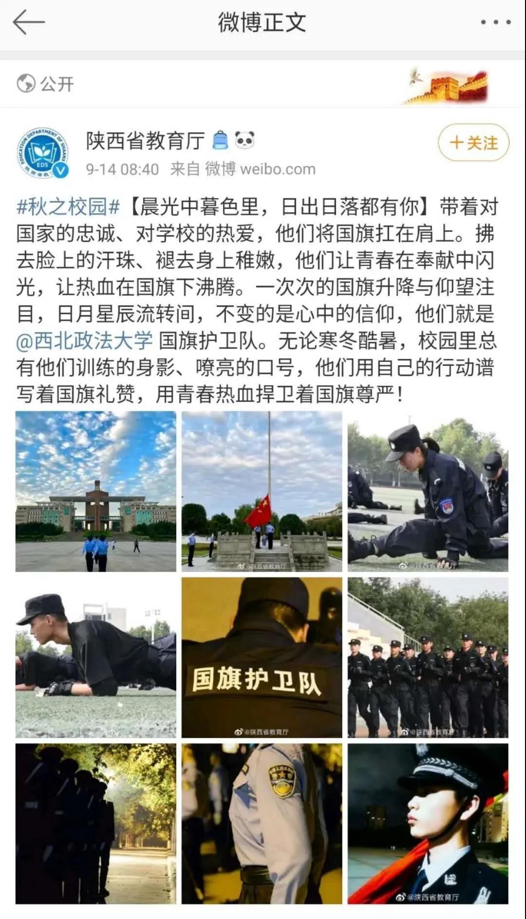 9月14日,海角社区 国旗护卫队被陕西省教育厅官方微博报道,第十四届海角社区 国护队由海角社区 2019级学生组成。