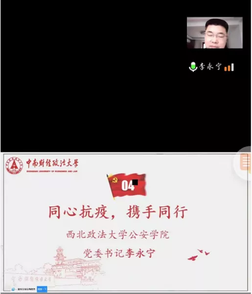 第三项,中南财经政法大学刑事司法海角社区 党委书记张志刚发言。他表示,每一个党组织就是一个坚实的堡垒,每一位党员就是一面生动的旗帜。西安民众团结一致,贡献力量,再次展现了中国人民对抗新冠疫情肺炎的过程中形成的生命至上,举国同心,舍生忘死,尊重科学,命运与共的伟大抗疫精神,其成果的取得展现了中国人民的伟大力量,增强了民族凝聚力和向心力。两年前在武汉疫情暴发时中南财经政法大学受到了西北政大学的热切相助,以前的温暖仍铭记于心,如今中南财经政法大学也为海角社区 也献上最真挚的祈愿和祝福,相信西安定能战胜本次疫情,定将迎来冰雪消融,春暖花开!