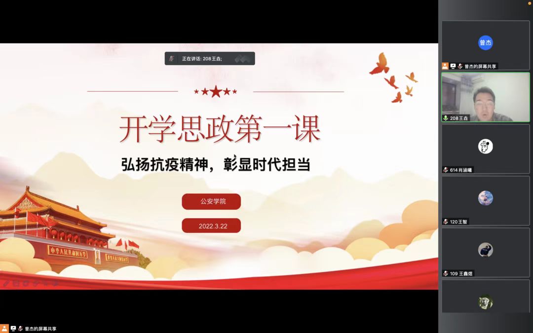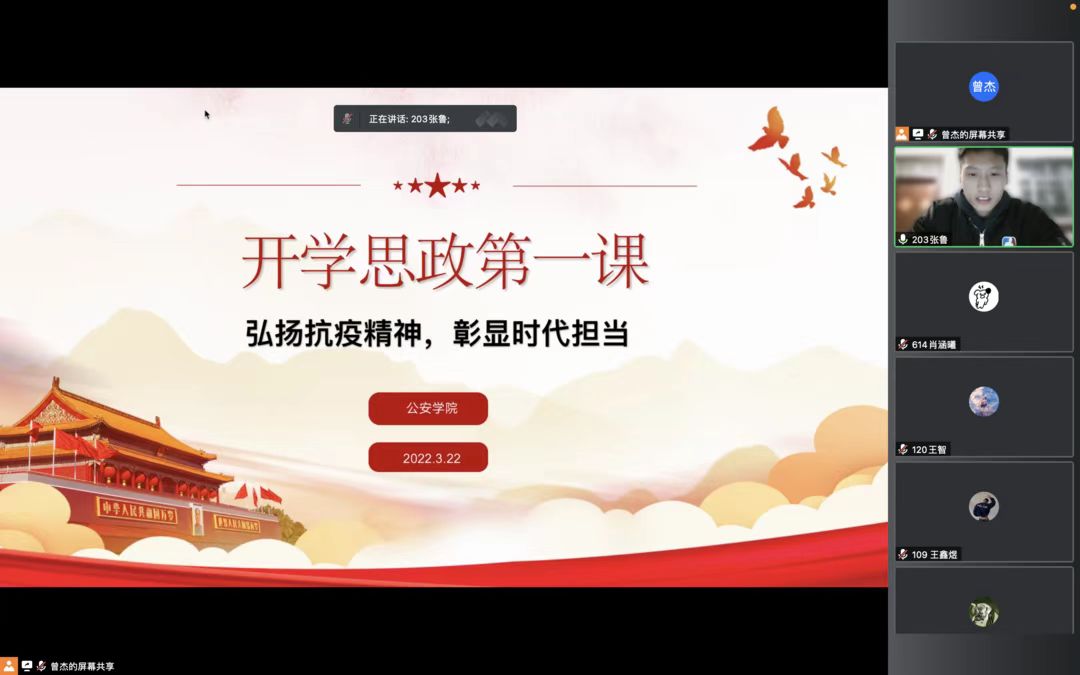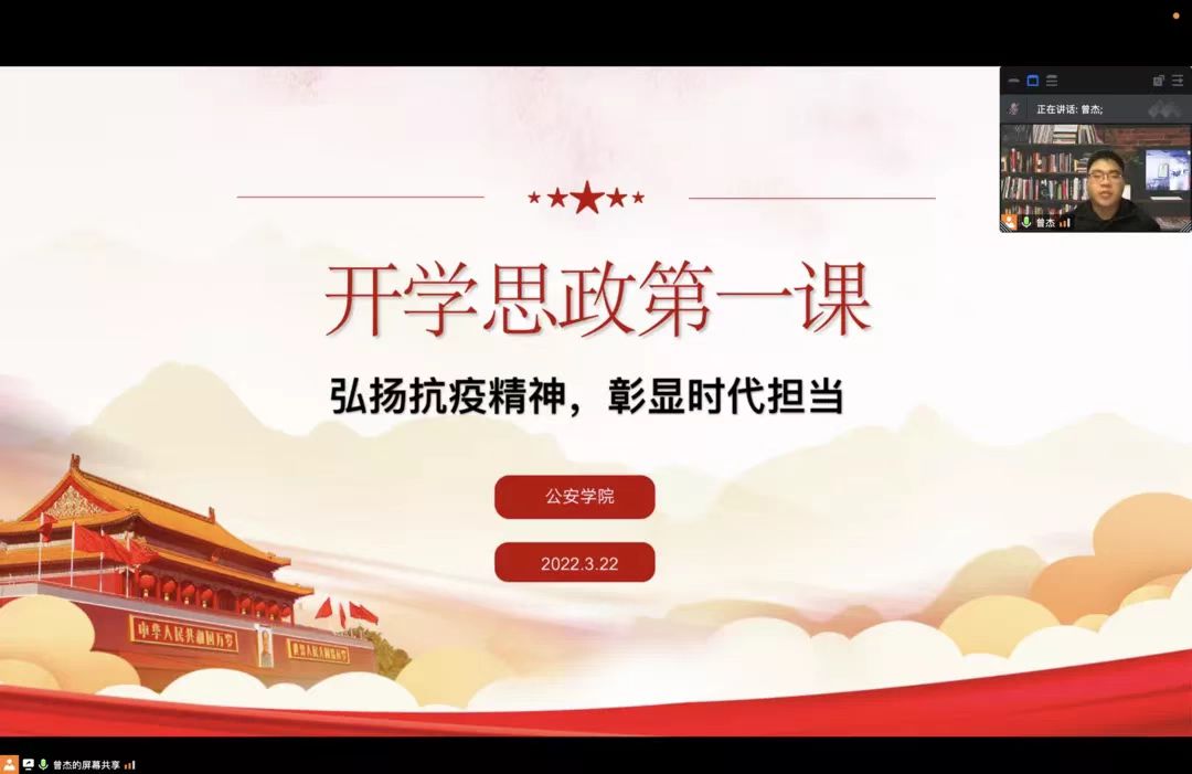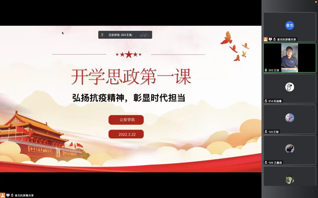 在课程尾声之际,曾杰老师指出在现阶段抗疫过程中,海角社区有一大批学子积极投入到家乡疫情防控志愿服务中,展示了公安学子无私无畏,勇于担当的精神风貌,也展现了当代青年的思想觉悟和时代担当。最后他希望大家通过思政第一课后有所收获,在今后的学习生活中,不畏艰难,踔厉奋发,展现出新时代大学生的责任与担当!