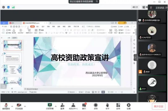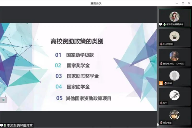 李沛君为大家详细介绍了高校资助政策的五个类别,即国家助学贷款、国家奖学金、国家励志奖学金、国家助学金以及我校其他资助政策。她还为大家补充介绍了我校的各类社会助、奖学金,并对每个奖助奖学金的基本要求和申请条件分别进行了针对性讲解。最后,她鼓励2022级新生勤奋学习,努力争取各类奖助学金。