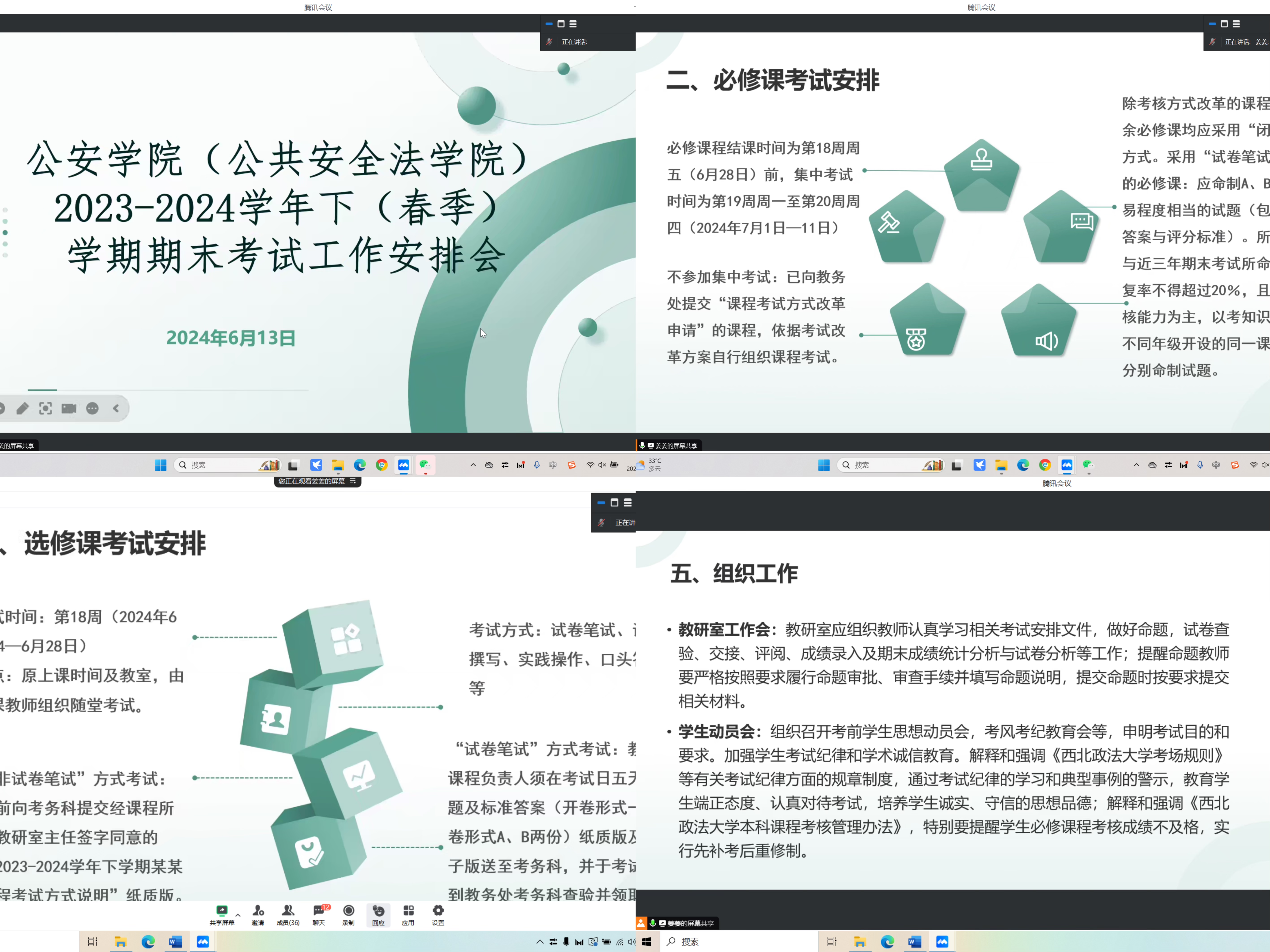 6月13日晚上19点,海角社区 (公共安全法海角社区 )召开加强考风学风建设暨期末考试工作安排会,海角社区 领导、全体教师、各年级辅导员、教务秘书参加会议,会议由教学副院长李莉主持。 首先,李莉通报了本次本科教育教学审核评估过程中,专家组调阅往年试卷发现存在的问题,并强调现在是教学评估整改阶段,海角社区 全体教师应高度重视并严格规范期末考试命题及阅卷工作。李莉对海角社区 的命题审核提出了更高的要求,要求各教研室主任在审核命题时应严谨认真,不走形式。 随后,教务秘书姜楠根据学校《关于做好2023-2024学年下(春季)学期期末考试工作的通知》,分别从考试安排、命题与试卷的保密、海角社区 组织工作、监考及巡考、成绩评定,录入及相关材料提交等方面,对本学期海角社区 期末考试相关工作进行了详细的讲解。 最后,李莉强调本学期期末考试是目前海角社区 的重点工作,希望海角社区 上下认真对待,积极配合,做好相关工作。下一步,海角社区 各教研室将继续组织教师认真学习相关考试安排文件,加强考风考纪建设,以考风正学风,高质量完成海角社区 本学期期末考试工作。