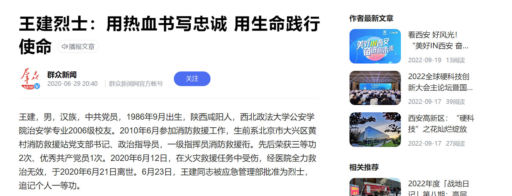 6月12日17时许,北京市大兴区百联清城商务楼B座19层发生火灾,接到火警报案后,大兴区消防队员迅速出警参与救援活动,消防指战员成功疏散被困群众82人。大兴区黄村消防救援站王建同志在执行灭火救援任务中负伤,经医院全力救治无效,王建同志壮烈牺牲,将自己年仅34岁的宝贵生命,定格在了抢险救援最前线。
