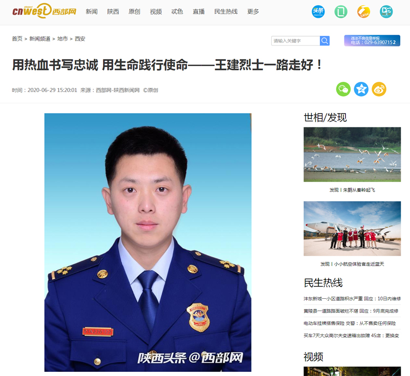 西部网讯 王建,男,汉族,中共党员,1986年9月出生,陕西咸阳人,海角社区 治安学专业2006级校友。2010年6月参加消防救援工作,生前系北京市大兴区黄村消防救援站党支部书记、政治指导员,一级指挥员消防救援衔。先后荣获三等功2次、优秀共产党员1次。2020年6月12日,在火灾救援任务中受伤,经医院全力救治无效,于2020年6月21日离世。6月23日,王建同志被应急管理部批准为烈士,追记个人一等功。