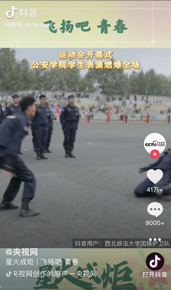 近日,我校第三届体育文化节暨第43届田径运动会隆重举行。国旗护卫队在运动会开幕式上表演的《当警笛再次拉响》青春洋溢、场面震撼,受到央视网、中国青年报、陕视新闻等多家主流媒体转载报道,展现出西法大青年蓬勃向上的精神面貌。国旗护卫队表演在抖音、微信等新媒体平台点赞量达百万余人次。